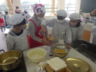 10月31日 JA豆腐作り体験 3年生 投稿: 校長 (13:11) 今年も、JA婦人部の皆さんによる「豆腐作り体験」を行いました。丸い大豆から、白くて四角い豆腐ができる。3年生の子どもたちがなんとなく分かっていることが、体験を通して深い理解となる。とても大事なことだと思います。JAの皆さんのご協力により、とてもよい体験ができました。ありがとうございました。 Tweet -
